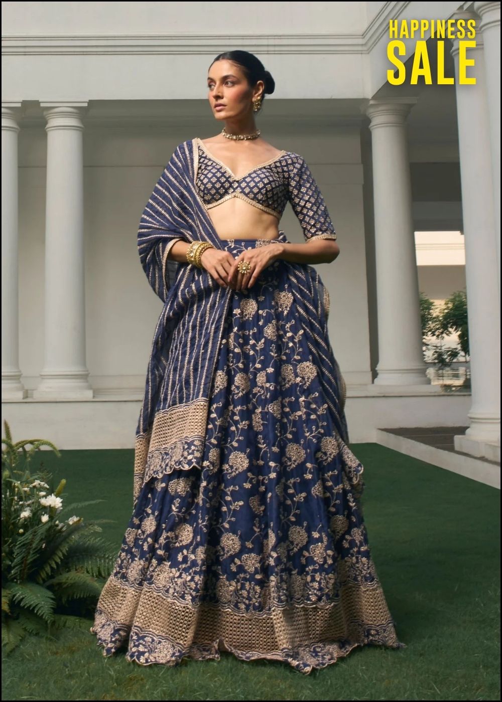 Chose this deep indigo lehenga for a destination sangeet and it turned heads all night. Can’t get over how rich and detailed the embroidery is!