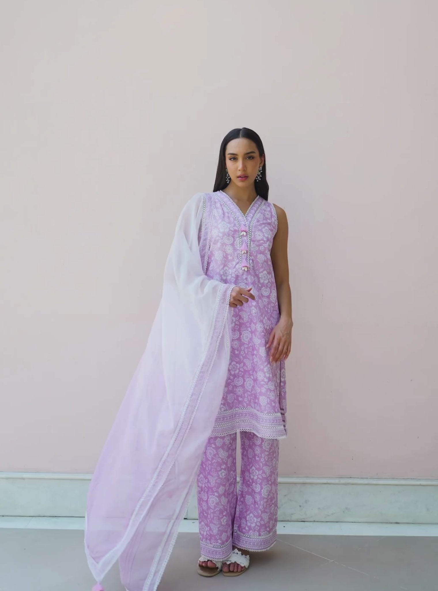 Arpora Supima Cotton Pink Kurta With Floral Lace Flared White Pant