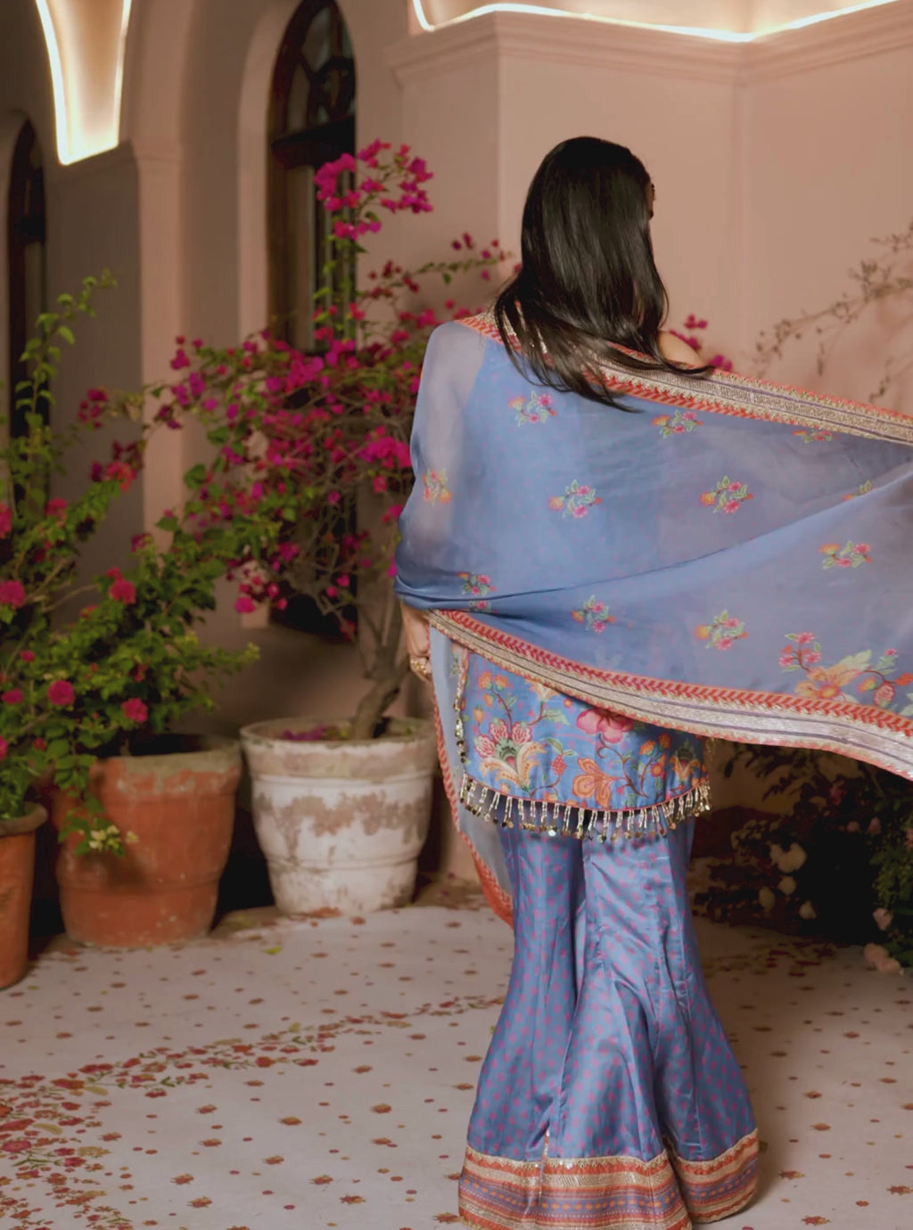 Chakori Linen Satin Steel Blue Printed Kurta Set
