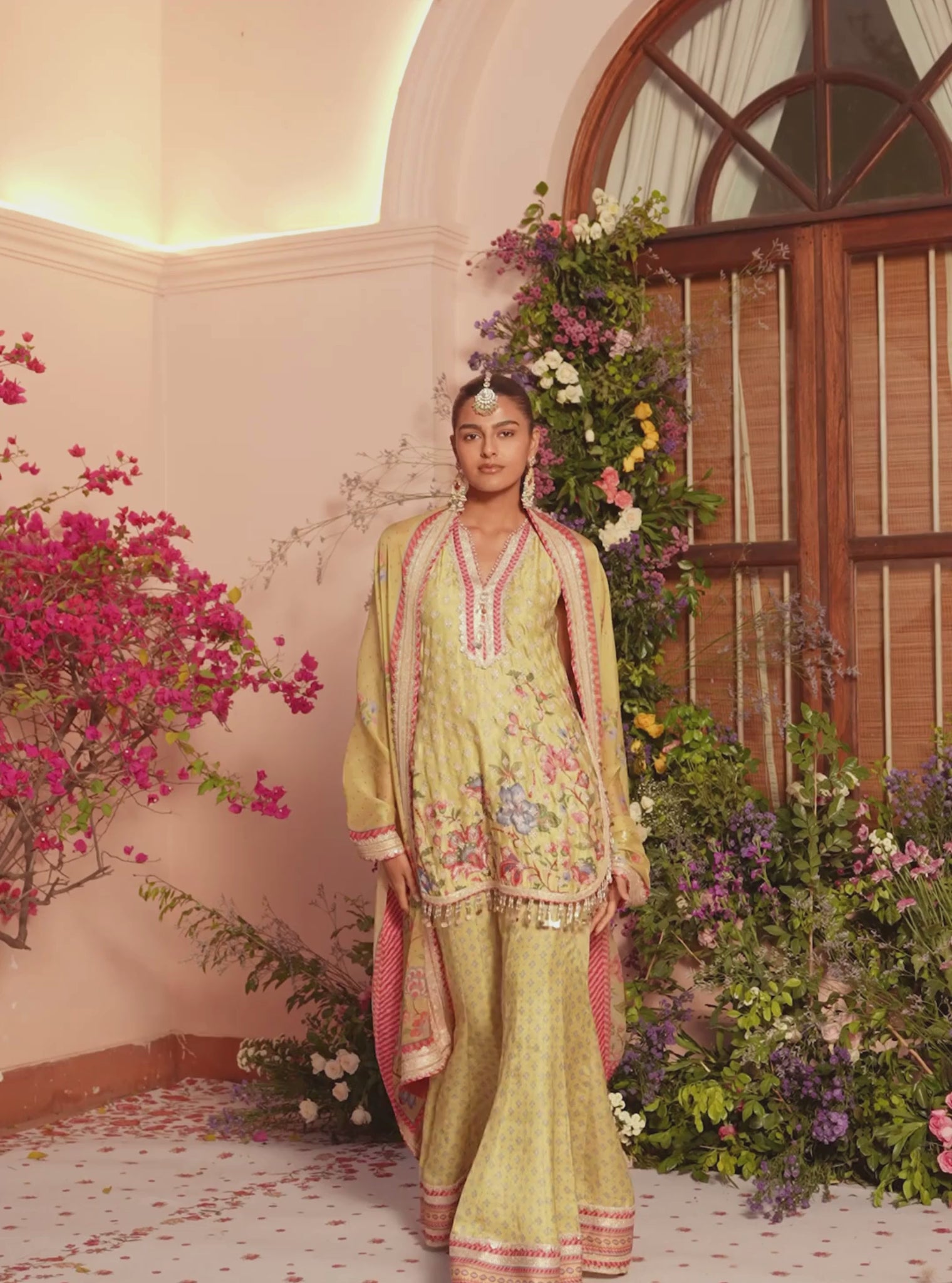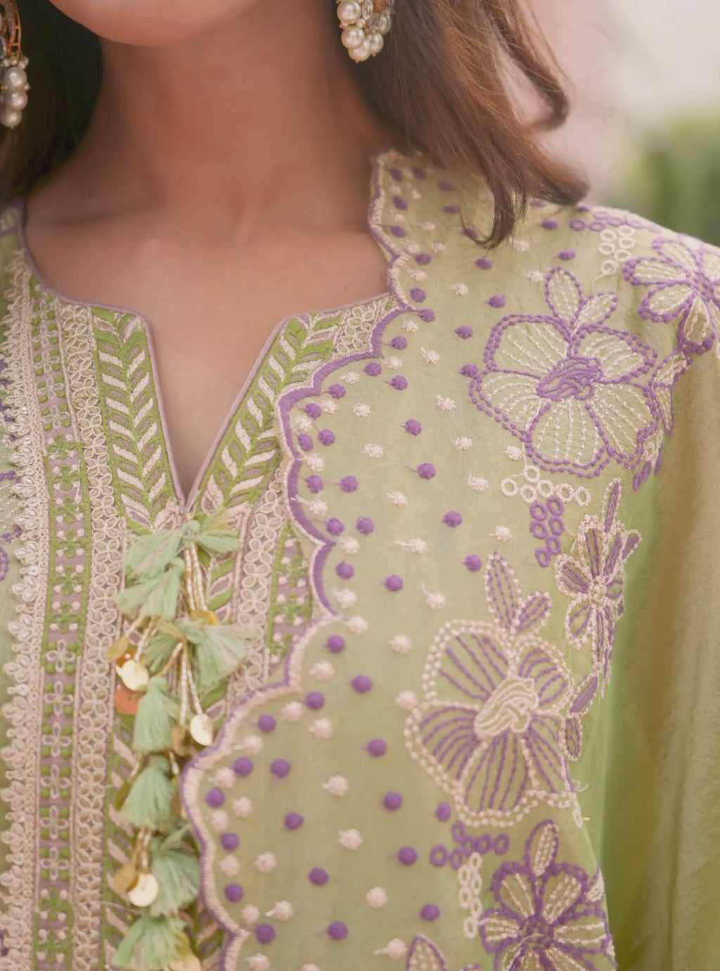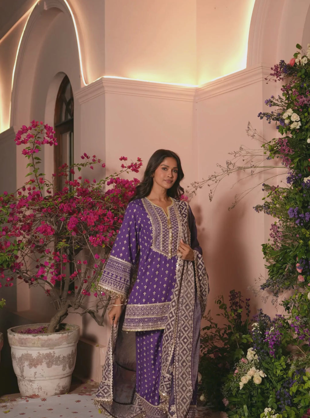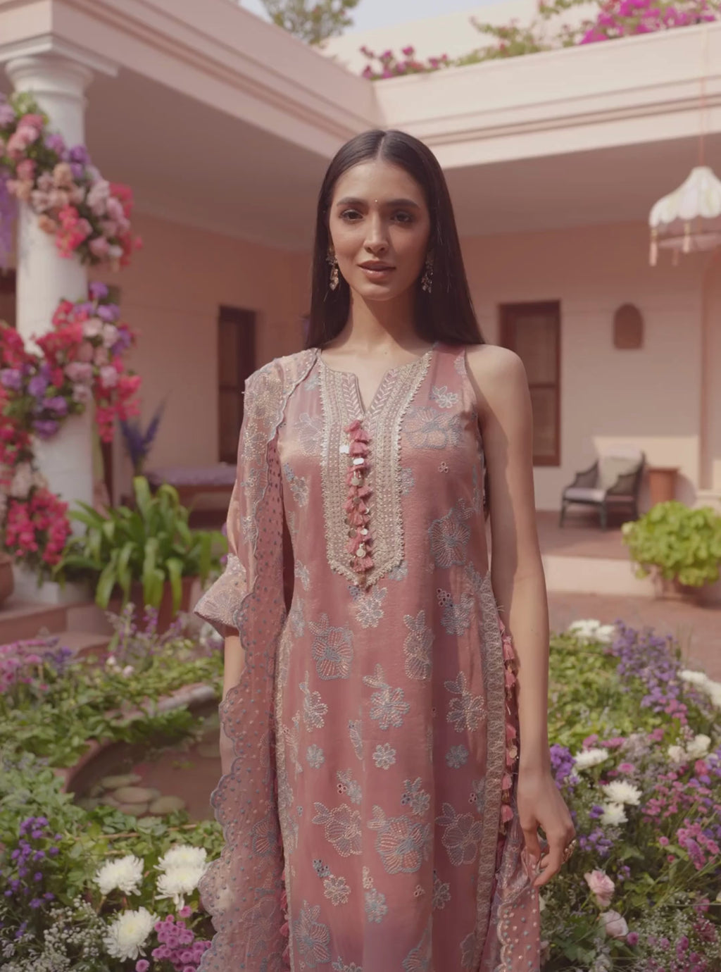 Phulkari Cupro Satin Rani Pink Kurta Set