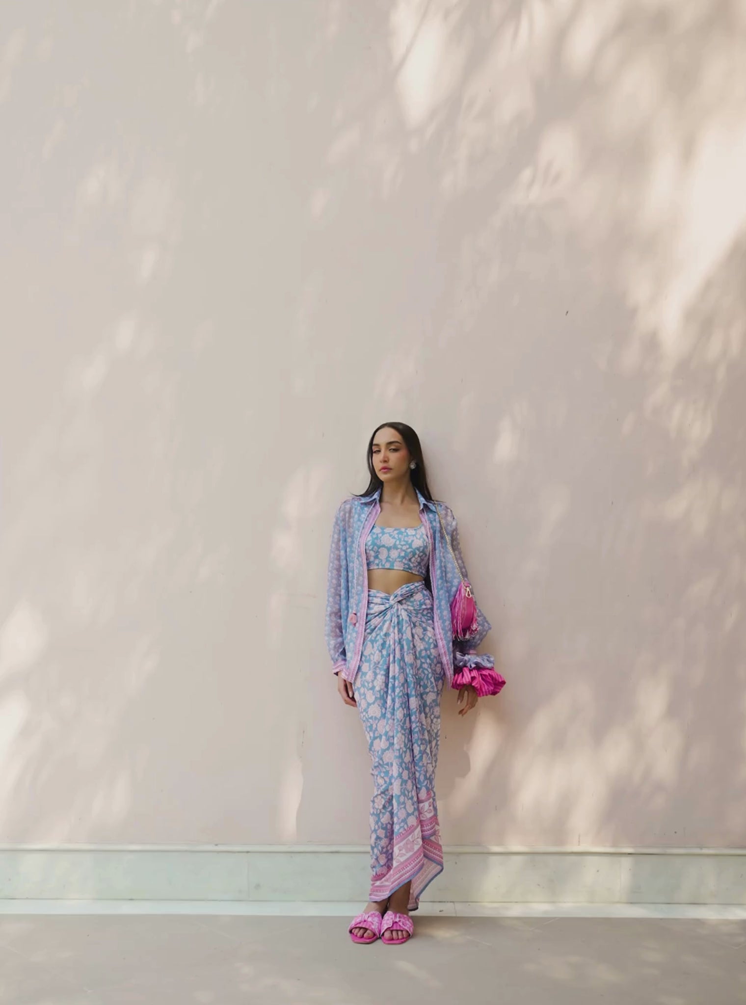 Nazeera Steel Blue Printed Organza Shirt & Lawn Skirt Set