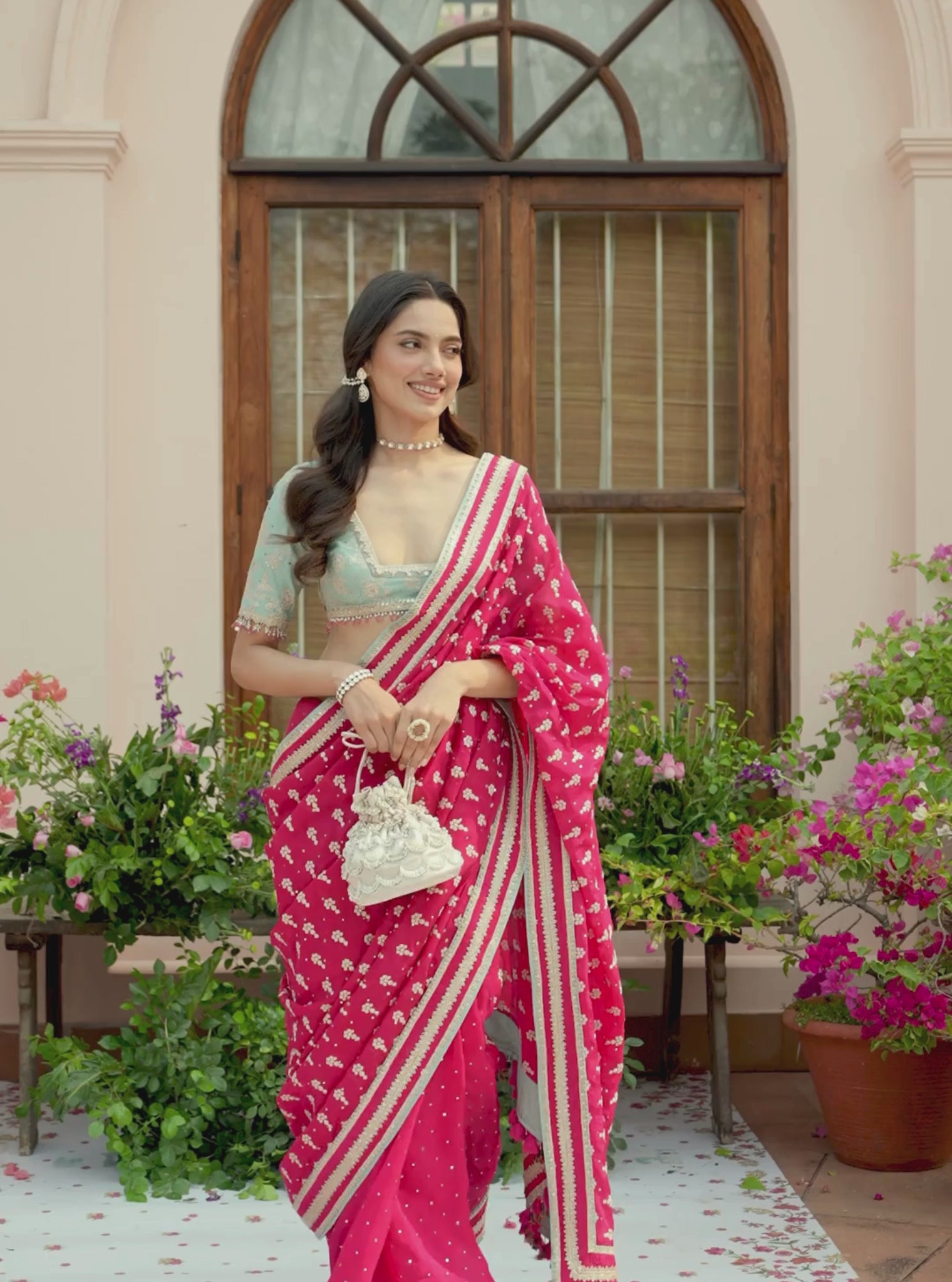 A refined festive saree crafted in airy Glass Organza that holds its shape while remaining light on the body. This Rani Pink saree features delicate motifs and a structured drape that feels elevated without excess. Paired with a contrast Pima Satin blouse that adds softness and balance to the look.