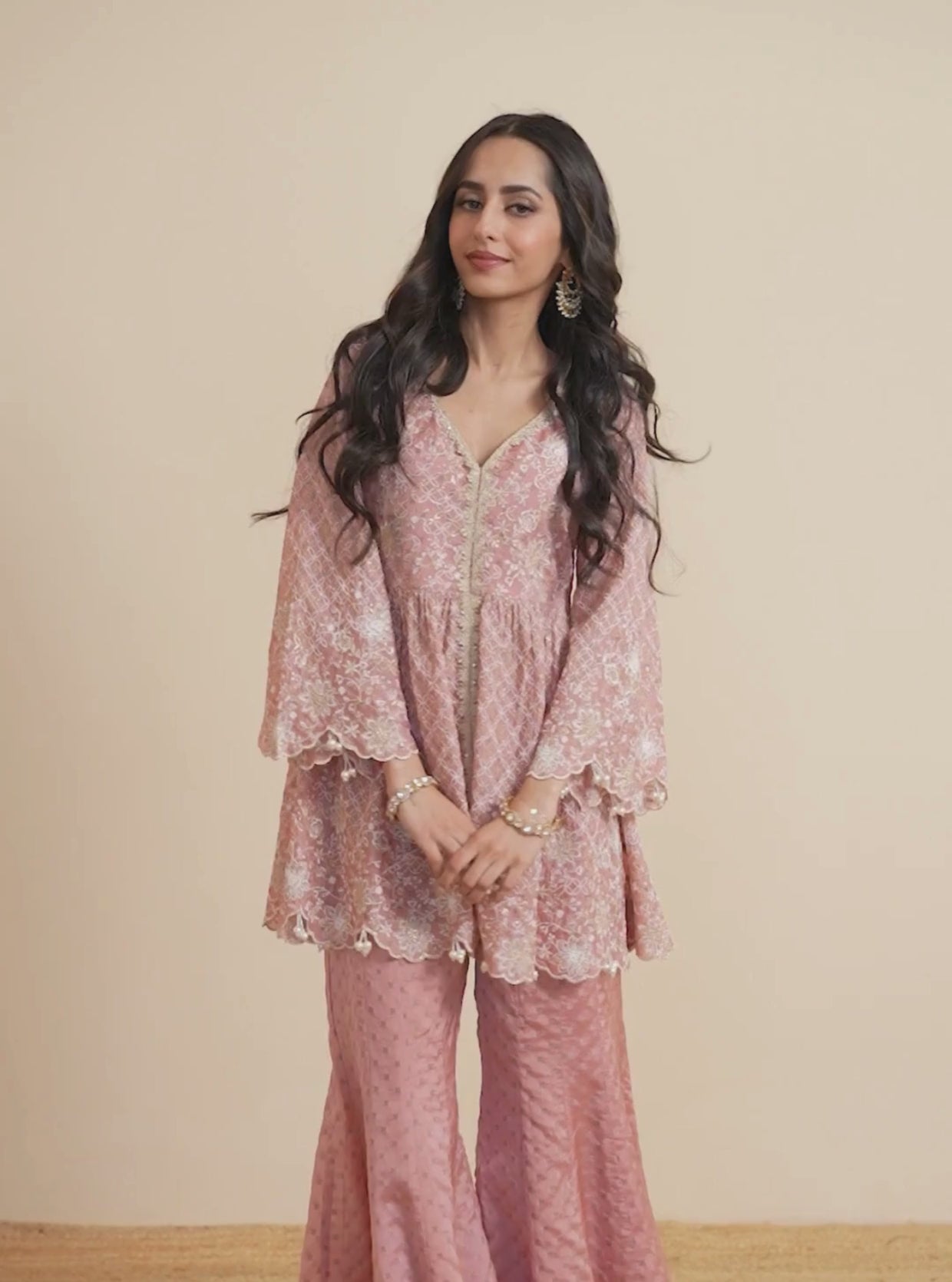 Charming And Contemporary, This Soft Pink Co-Ord Set Is A Breath Of Fresh Air For Wedding Celebrations. The Short Peplum-Style Kurta, Adorned With Intricate Floral Embroidery, Brings A Playful Vibe. Paired With Flared Pants In A Complementing Tone, The Ensemble Moves Like A Dream — Effortlessly Fusing Comfort With Chic. Whether You'Re Heading To A Mehendi Brunch Or A Floral-Themed Haldi, This Look Is All About Twirling In Style.