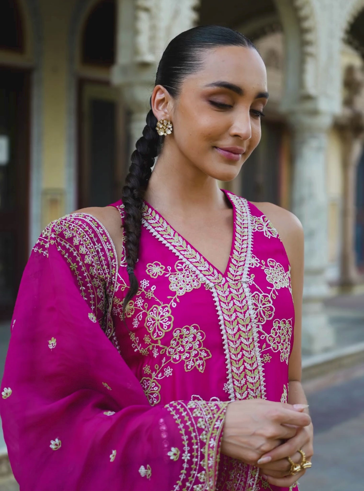 The Jivara Kurta In Fuschia Is The Ultimate Rakhi Stunner; Lively, Elegant, And Loaded With Intricate Details. Cut In Lightweight Bemberg Satin, The Sleeveless Kurta Features Tonal Thread Embroidery In Floral Bootis, Detailed With Delicate Gota. The Neckline And Hem Are Framed With Multi-Panelled Embroidered Borders And Tiny Scalloped Lace Inserts. The Straight-Fit Pants Mirror The Detailing At The Cuff, Creating A Cohesive Look. Paired With A Scallop-Edged Organza Dupatta Embroidered With Floral Motifs And Finished With Lace Trims; This One'S A Bold Pick For Golden Hour Gatherings And Day-Long Festivities.