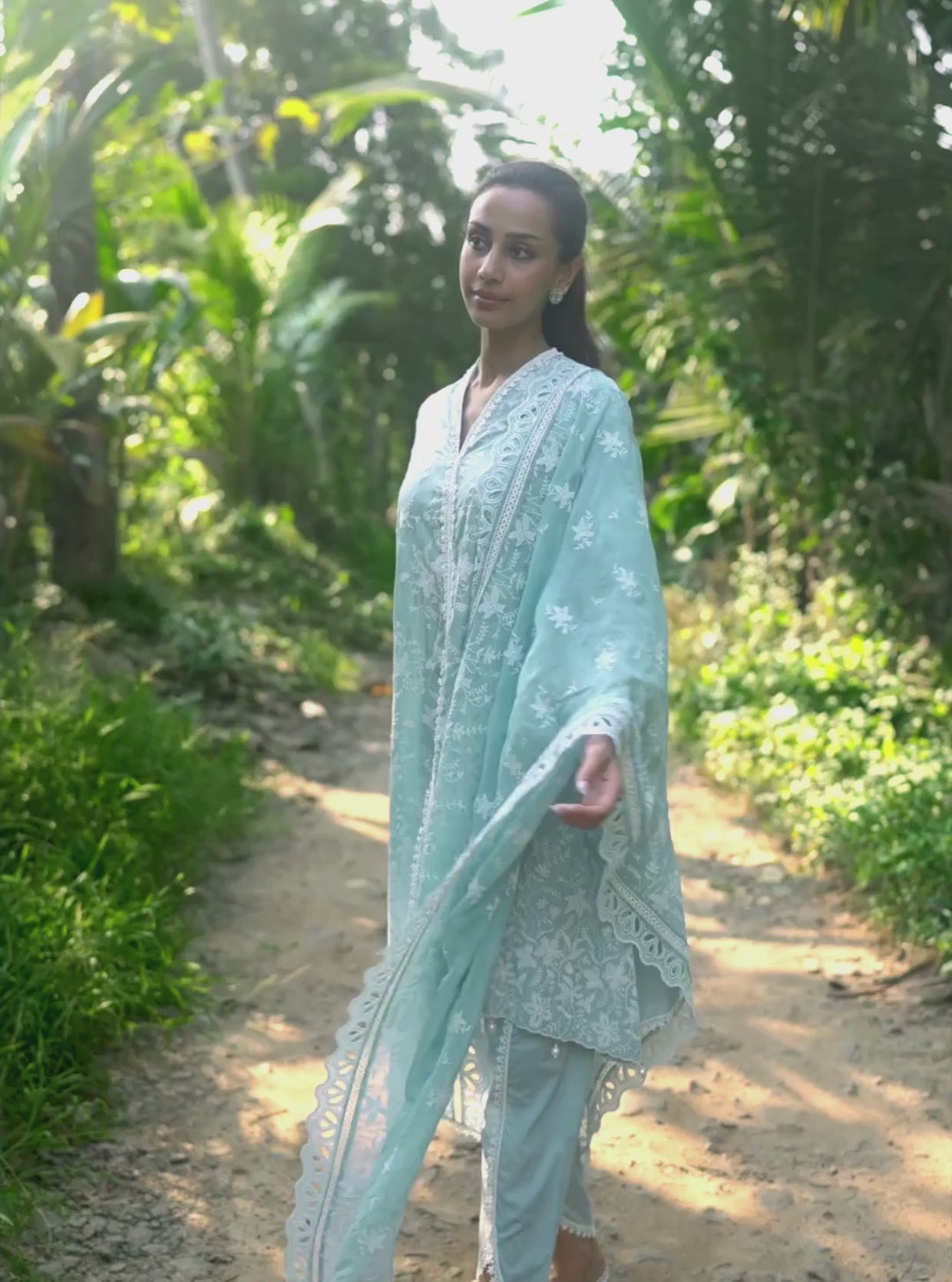 This Serene Powder Blue Cotton Kurta Set Exudes A Sense Of Effortless Elegance And Charm. The Kurta Is Adorned With Delicate White Floral Embroidery. The A-Line Silhouette Is Elevated By The Softly Scalloped Hem, The Finely Crafted Lace Detailing On The Sleeves, And The Dainty Tassels.