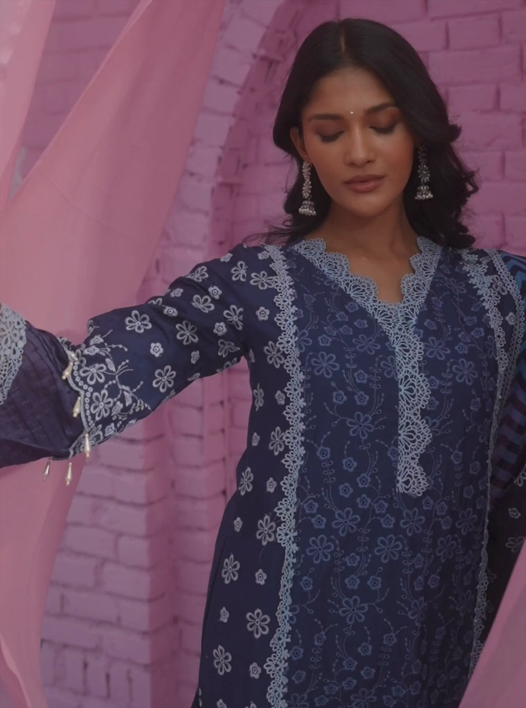 This Regal Navy Kurta Set Perfectly Blends Tradition And Contemporary Flair. The Kurta Is Adorned With Delicate White Floral Motifs That Stand Out Beautifully Against The Deep Blue Fabric, Creating A Captivating Contrast. The V-Neckline, Sleeves, And Hemline Are Decorated With Intricate Lace Trim, And Accentuated With Delicate Pearl Hangings. The Matching Straight Trousers Have Similar Lace Trim At The Cuffs, Ensuring A Harmonious And Polished Appearance.