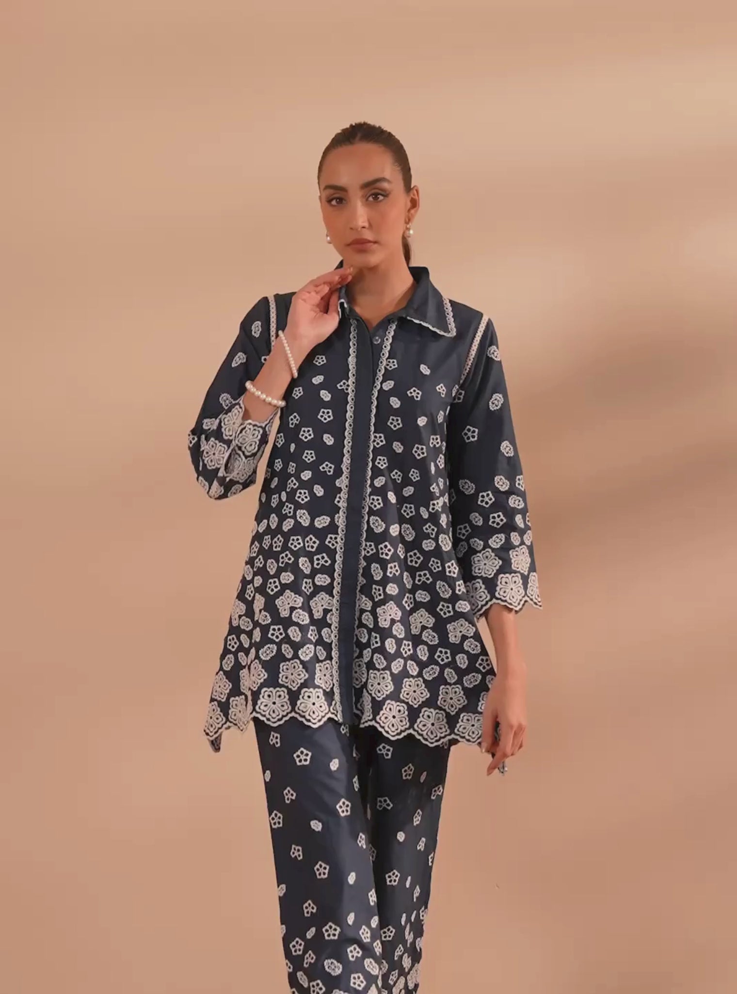 Bring Understated Elegance To Your Everyday Wardrobe. This Set Is Defined By Its All-Over White Embroidery, On The Deep Navy Base, That Grows Denser Along The Hemline And Cuffs, Ending In Delicately Scalloped Edges.