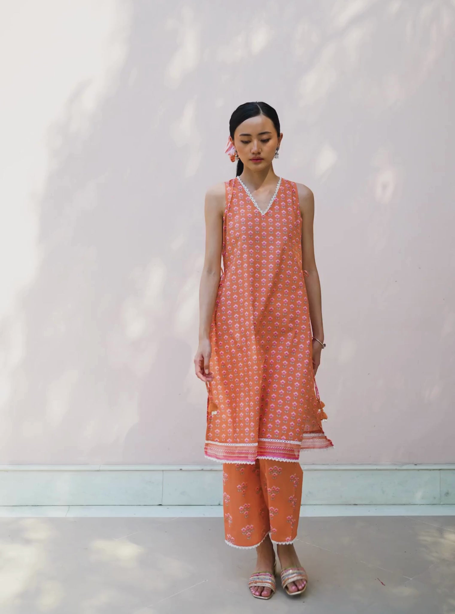 The Rajvella Kurta Set In Orange Features A Sleeveless Kurta With Dainty Booti Motifs And Finished With Ladder Lace, A Contrast Border, And A Side Slit With A Tie-Up Detail, Complete With Thread And Shell Tassels. It'S Styled With Matching Straight-Fit Pants Printed In A Mix Of Gadh Motifs. A Soft Leheriya-Inspired Striped Organza Dupatta With Lace And Printed Border Detailing Brings The Full Look Together.