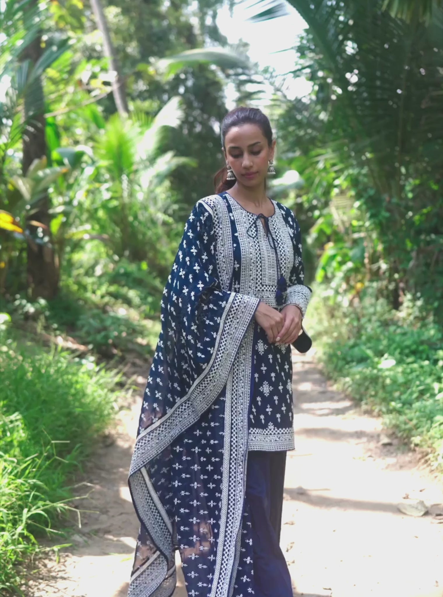 Embrace Summer With This Navy Blue Kurta Set, A Perfect Blend Of Comfort And Tradition. The Relaxed-Fit Short Kurta, Adorned With Delicate White Embroidery, Exudes An Understated Charm That Is Both Timeless And Versatile. Framed With Intricate Geometric Borders And A Tie-Up Neckline With Tassels, This Piece Brings An Artisanal Touch To Everyday Dressing. Paired With Broad Palazzo Pants In A Deep Navy Hue, This Set Offers A Breezy Silhouette, Making It An Ideal Choice For Warm Summer Days. The Coordinating Dupatta, Adorned With Intricate Patterns And A Striking Contrast Border, Adds A Regal Flair To The Ensemble.