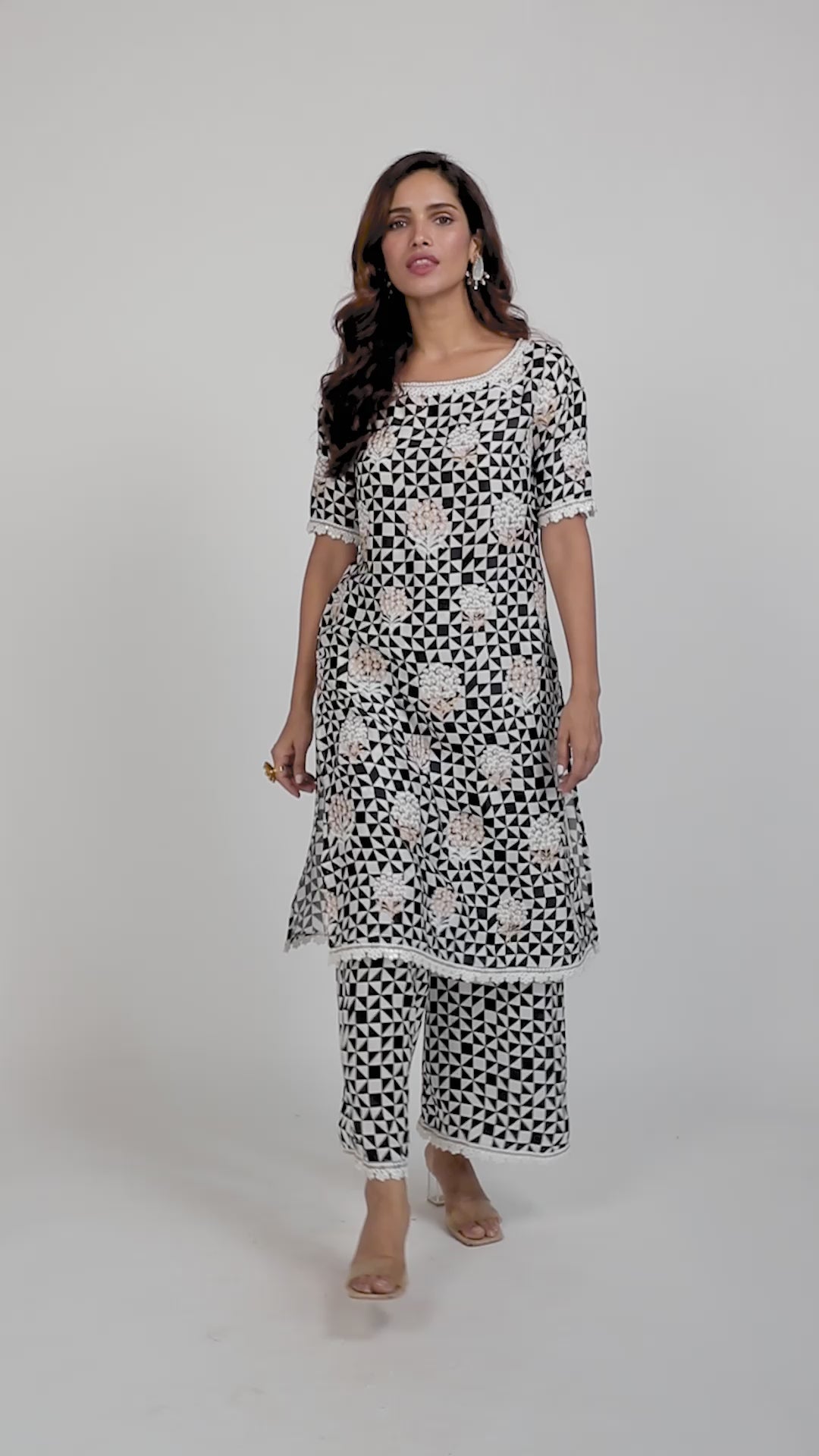 Overall Kaleidoscope Print With Floral Motif Embroidery In Panels