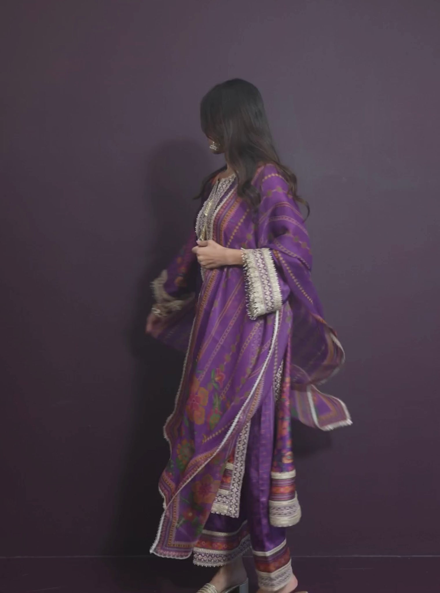 A Purple Printed Kurta In Cupro Satin, Styled With Matching Pants And An Organza Dupatta. Effortless And Graceful For Festive Wear."