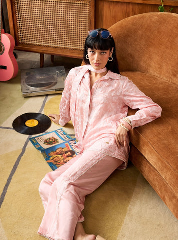 This cupro satin shirt set is designed for movement and modern dressing. The smooth, breathable fabric gives the silhouette a soft structure, while the clean tailoring keeps it versatile across occasions. Easy to style together or as separates, it’s a set that works from intimate celebrations to formal festivities.