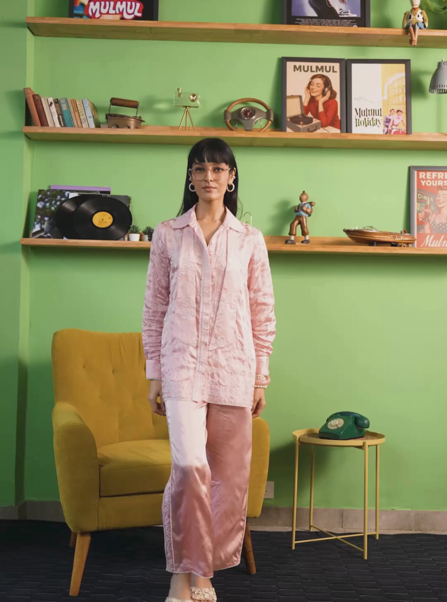 Zuvina Cupro Satin Onion Pink Shirt Set