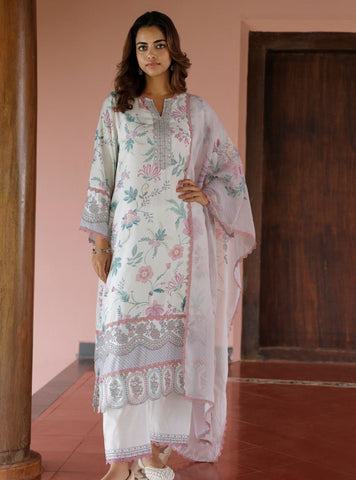 The Ensemble Is Completed With A Striped And Floral Printed Dupatta With Fine Lace Borders.