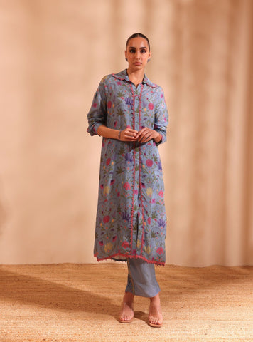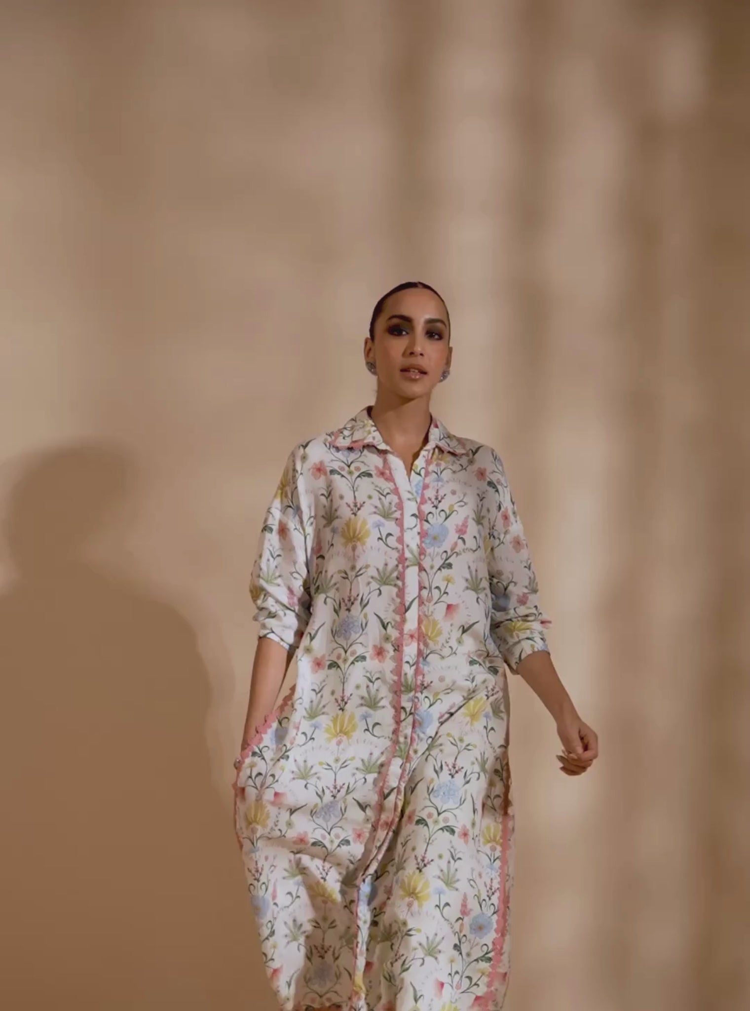 This Floral Kurta Set Is A Perfect Blend Of Understated Elegance And Playful Charm, Making It An Ideal Choice For Spring And Summer Outings. The Kurta Features A Pristine White Base Adorned With Delicate Floral Prints In Vibrant Shades Of Pink, Yellow, And Green. The Kurta Is Designed With A Classic Shirt Collar And A Button-Down Front, Giving It A Modern, Yet Timeless Appeal. This Piece Is Versatile Enough For Both Formal And Casual Occasions. The Delicate Pink Lace Trim Along The Hemline And Button Placket Adds A Feminine And Intricate Detail, Elevating The Overall Design.