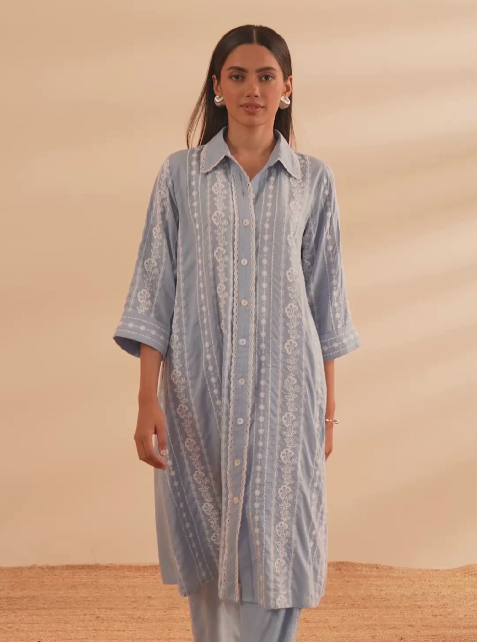 Bask In The Beauty Of Breezy Blues With This Timeless Shirt And Trouser Co-Ord That Brings Effortless Elegance To Your Everyday Life. Tailored In A Soothing Pastel Blue, The Shirt Features Delicate Vertical Embroidery And A Clean Button-Down Front, Lending A Graceful, Lengthening Silhouette. The Collared Neckline And Three-Quarter Sleeves Balance Structure With Ease.