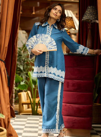 Effortless Elegance Meets Everyday Ease In This Blush Pink Co-Ord Set. Crafted In A Soft, Breathable Linen, The Silhouette Is Relaxed Yet Refined—Perfect For Sunny Brunches Or Chic Lounging. The Shirt Features Delicate Embroidered Trims Along The Collar, Placket, And Statement Bell Sleeves, Adding A Touch Of Feminine Charm. Paired With Wide-Legged Trousers Edged With Matching Intricate Embroidery, This Set Blends Comfort And Style In The Most Graceful Way.