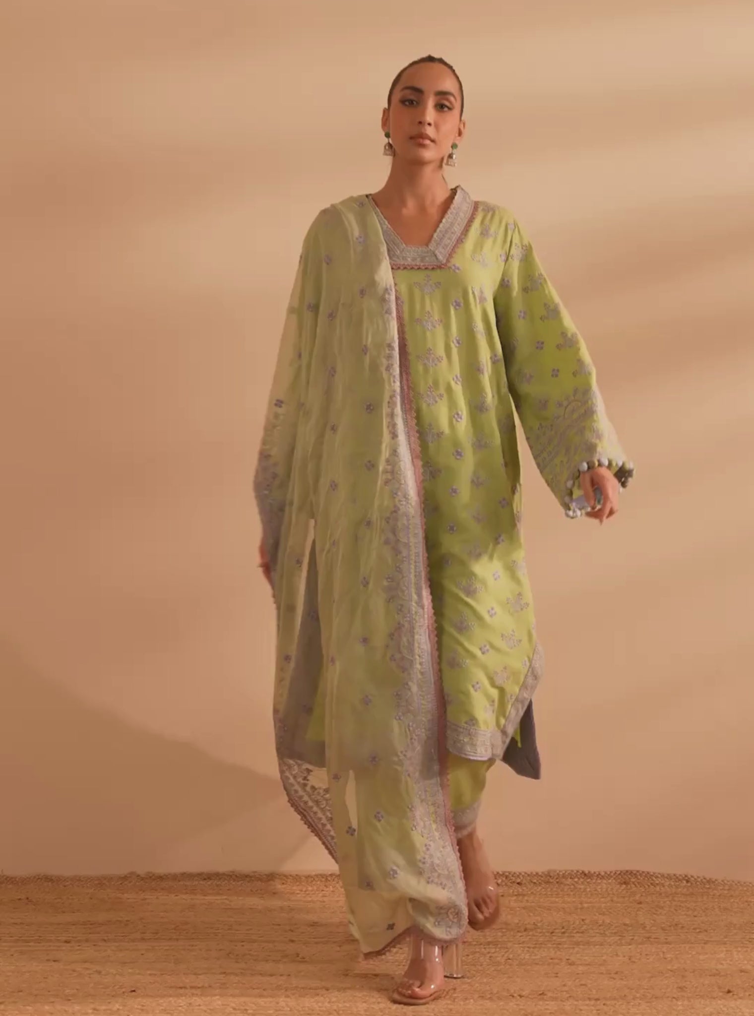 The Matching Pants Carry The Same Soft Lime Palette, Enhanced With Embroidered Detailing At The Hem. Completing The Ensemble Is A Statement Dupatta— Adorned With A Harmonious Blend Of Delicate Embroidery. Soft, Serene, And Striking In Its Simplicity—This Set Is Your Go-To For Understated Celebrations And Refined Everyday Wear.