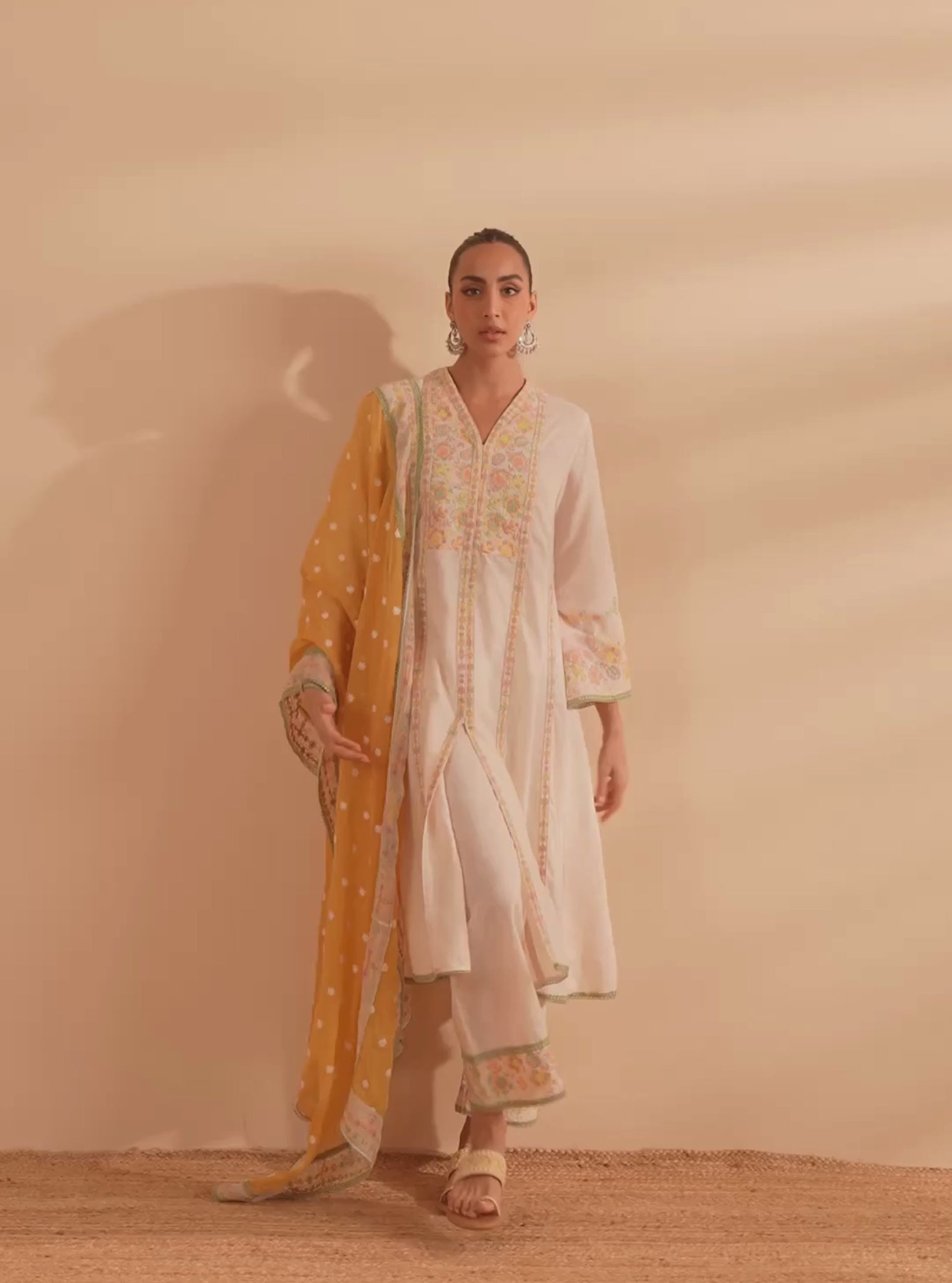 The Set Is Paired With Straight Pants With Embroidered Borders At The Hem. Adding A Vibrant Contrast To The Muted Ivory Is The Yellow Dupatta, Adorned With Delicate Embroidery And Bordered With Floral Detailing, Infusing The Outfit With A Cheerful Warmth.
