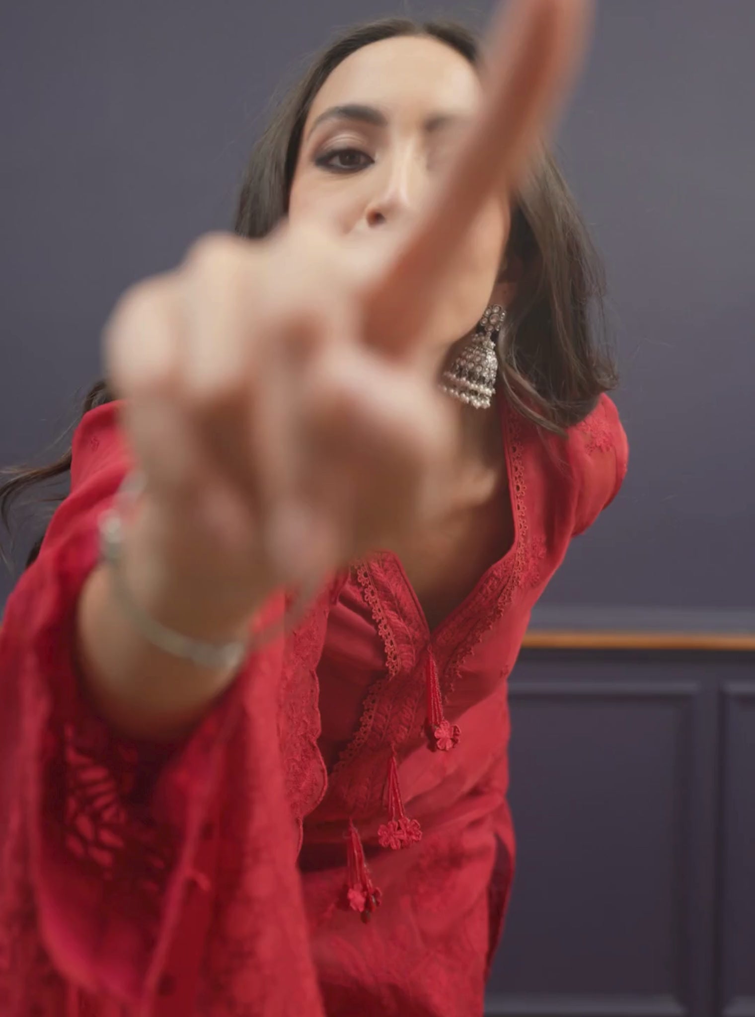 A Straight Kurta In Airy Organza Paired With Pima Satin Pants. This Red Kurta Set Is Finished With An Organza Dupatta Featuring Delicate Printed Accents, Making It A Lightweight Yet Festive Choice.