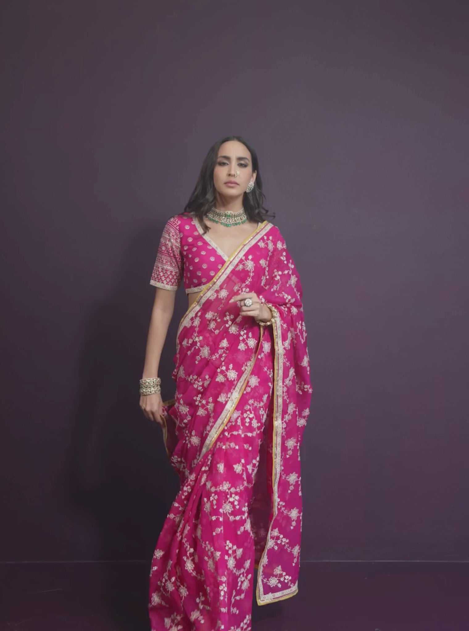 Vivid Fuschia Organza, Draped Into A Breezy Saree That Balances Boldness With Grace. Finished With A Matching Blouse, It’S Made For Festive Moments That Call For Colour And Charm.