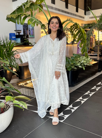 Paired With Coordinated Straight Pants Featuring Subtle Lace Trims, This Set Strikes The Perfect Balance Between Tradition And Modernity. The Dupatta, Embellished With Fine Embroidery And Scalloped Edges, Completes The Look With A Whisper Of Elegance.