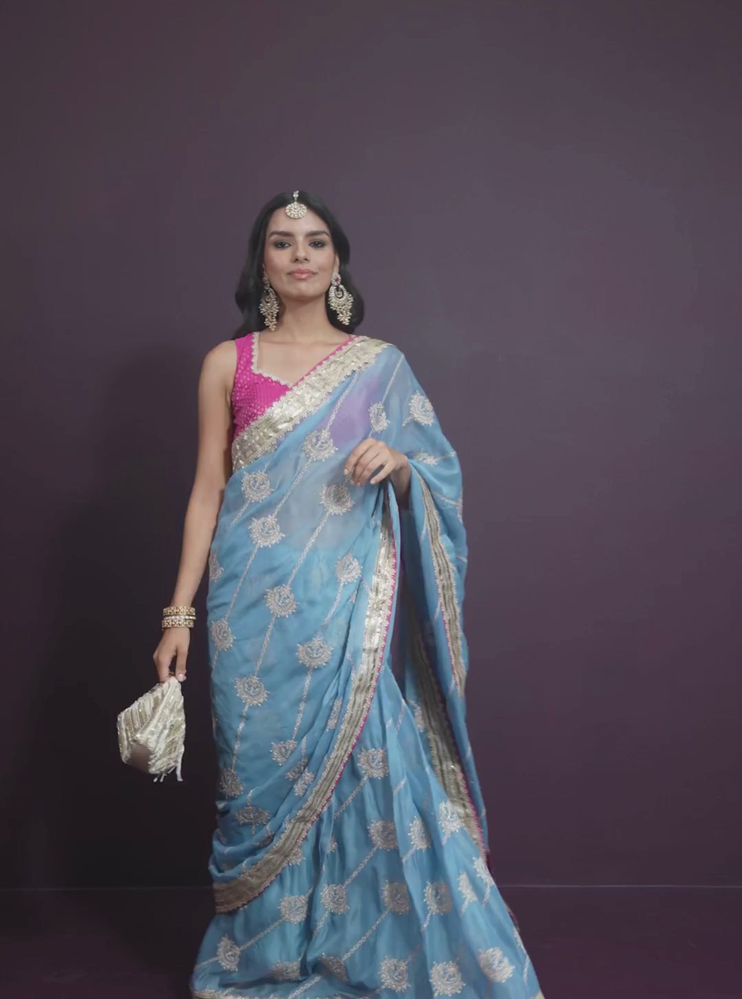 An Ethereal Organza Saree In Steel Blue, Paired With A Fuschia Polka-Dot Blouse In Pima Satin. A Playful Clash Of Colour And Print, Designed To Feel Both Youthful And Elegant.