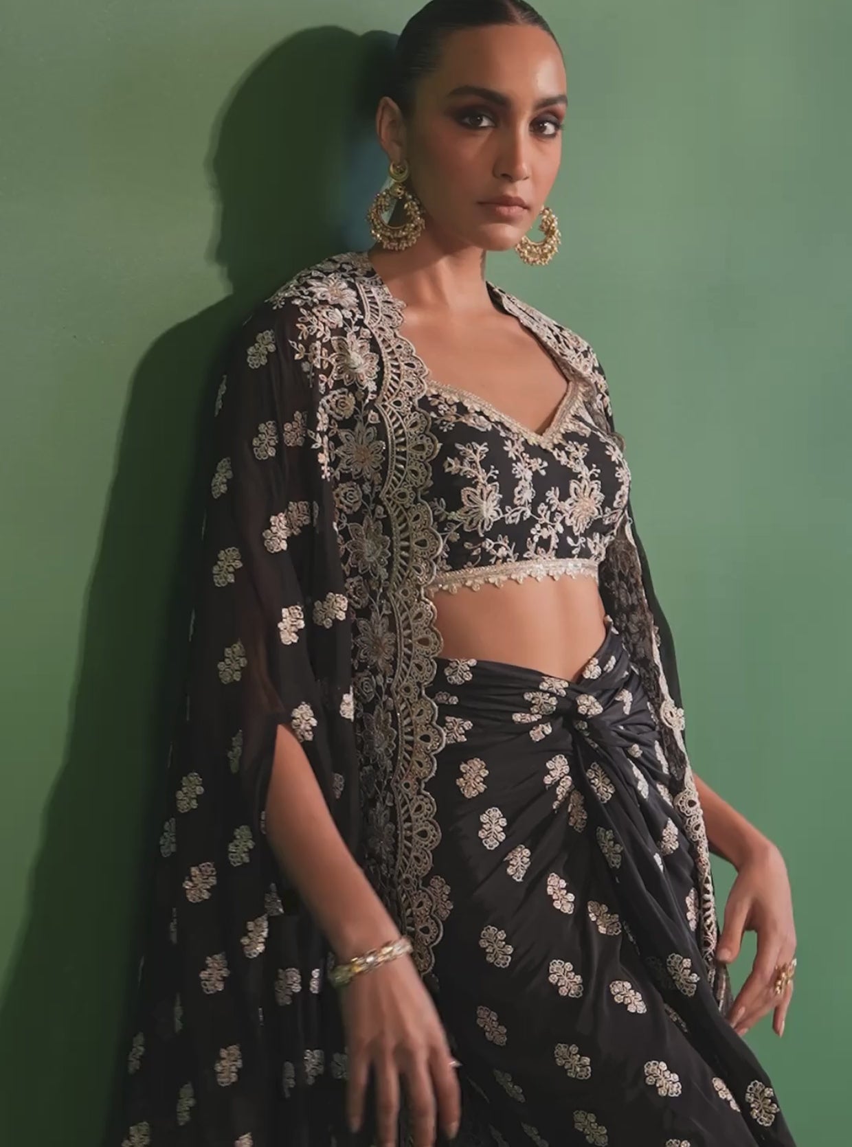 Draped In The Elegance Of Midnight, This Black Embroidered Skirt Set Is A Symphony Of Grace And Grandeur. Crafted In Luxurious, Lightweight Fabrics, The Ensemble Features A Beautifully Embroidered Pre-Draped Skirt That Flows Effortlessly, Cinched At The Waist With Artful Gathers Creating A Flattering Silhouette. Delicate Floral Motifs Cascade Across The Fabric. The Highlight Of This Set Is The Sheer, Floor-Length Cape—An Embodiment Of Regal Sophistication. Trimmed With Intricate Embroidered Borders, It Drapes Gracefully Over The Shoulders, Creating An Alluring Play Of Sheer And Opaque Textures.