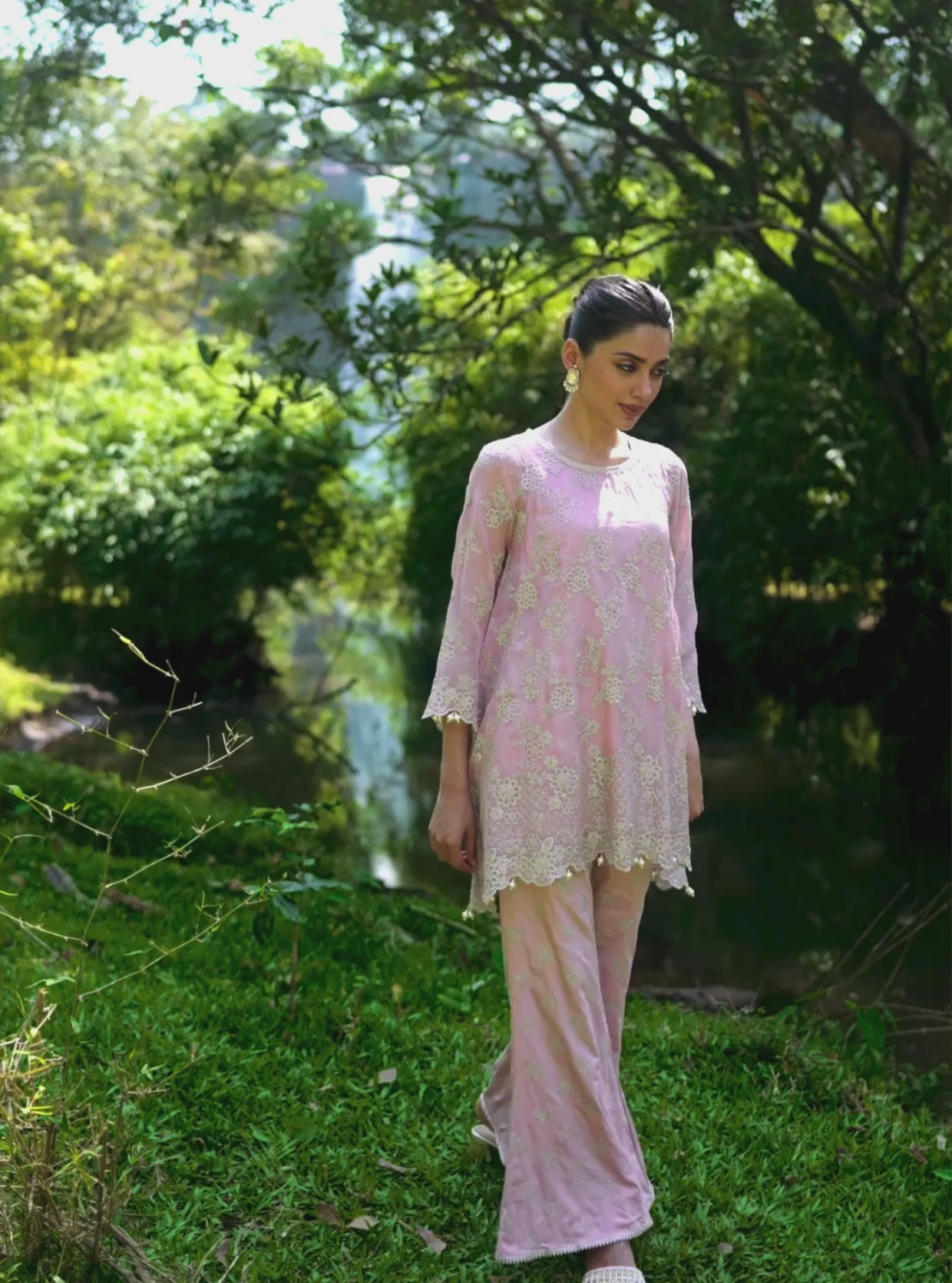 Elevate Your Ethnic Wardrobe With This Soft Pink Co-Ord Set That Exudes Sophistication And Charm. The A-Line Kurta, Adorned With Intricate Silver Floral Embroidery, Showcases A Beautiful Interplay Of Elegance And Tradition. Paired Perfectly With Flared Palazzo Pants, The Set Creates A Flattering And Comfortable Silhouette. The Subtle Silver Accents On The Palazzo Mirror The Kurta’S Embroidery, Harmonizing The Ensemble.
