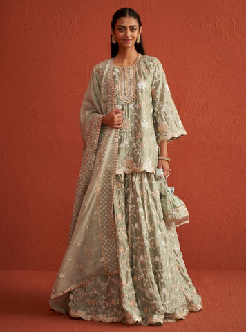 No Better Way To Make A Statement This Wedding Season Than With This Refreshing Sage Green Lehenga. The Floral Embroidery Sprawled Across The Flared Skirt And The Matching Kurta Creates An Opulent And Radiant Ensemble. The Intricate Sequin Gotta On The Neckline Adds A Subtle Shimmer, Making This Ensemble Perfect For Daytime Festivities. The Light, Airy Fabric Ensures Both Comfort And Style, Making It Ideal For Long Celebrations.