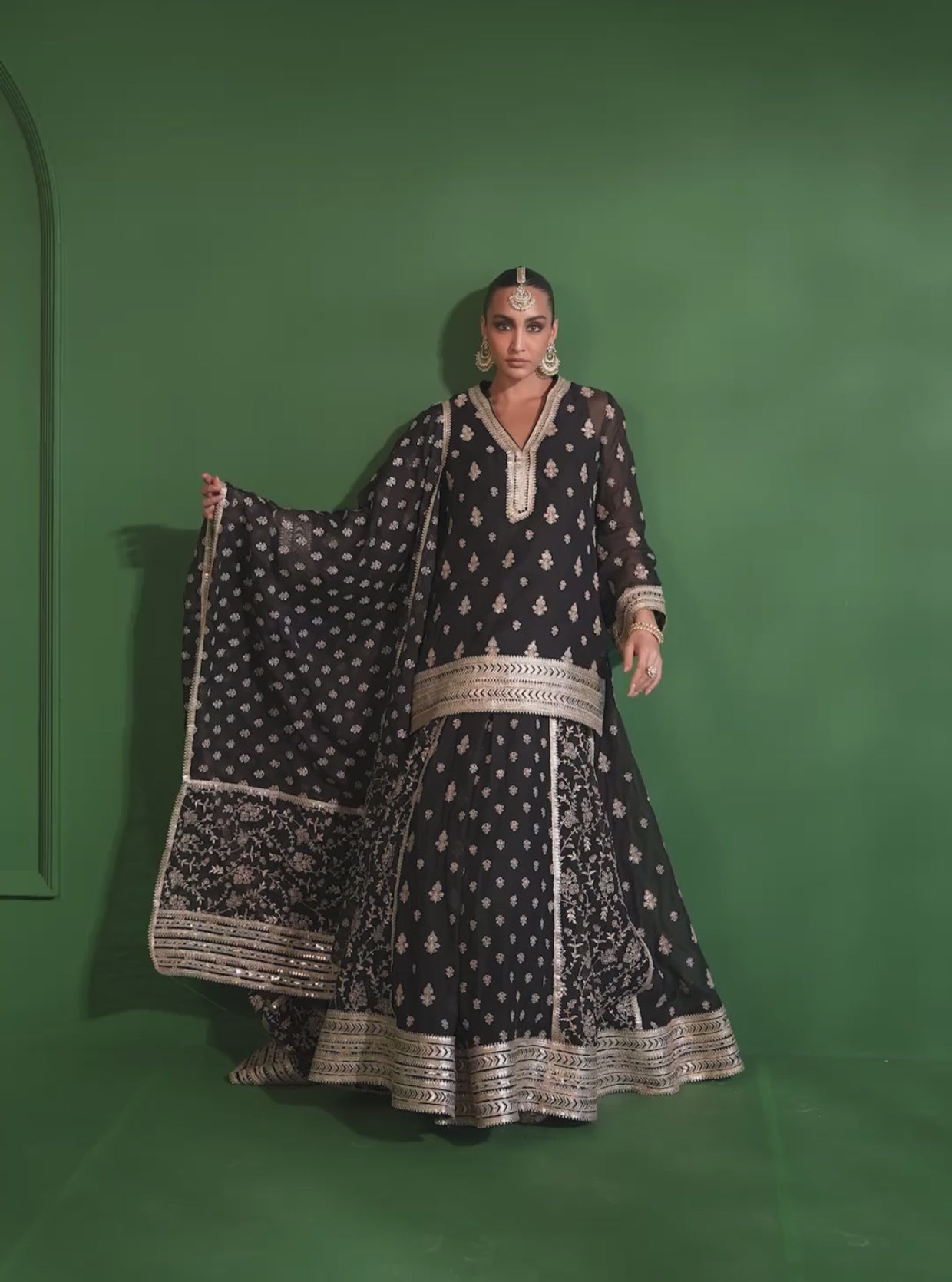 The Kurta-Style Top, With Its V-Neckline And Full Sleeves, Brings An Elegant Yet Contemporary Touch To The Silhouette. Intricately Embroidered Along The Neckline And Cuffs, The Design Exudes Understated Opulence, Making It A Perfect Choice For Evening Soirées And Wedding Festivities.