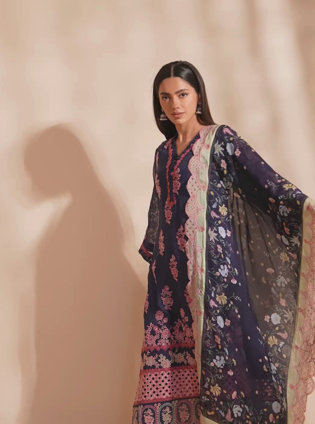 Embrace Effortless Elegance With This Stunning Navy Blue Kurta Set, A Perfect Blend Of Comfort And Sophistication For The Summer Season. Crafted From Breathable And Lightweight Organza, The Kurta Features Delicate Floral Embroidery In Soft Pink, Adding A Feminine Touch To The Deep-Toned Canvas. The V-Neckline Is Adorned With Intricate Embroidery, And The Flared Three-Quarter Sleeves Bring A Graceful Movement To The Silhouette.
