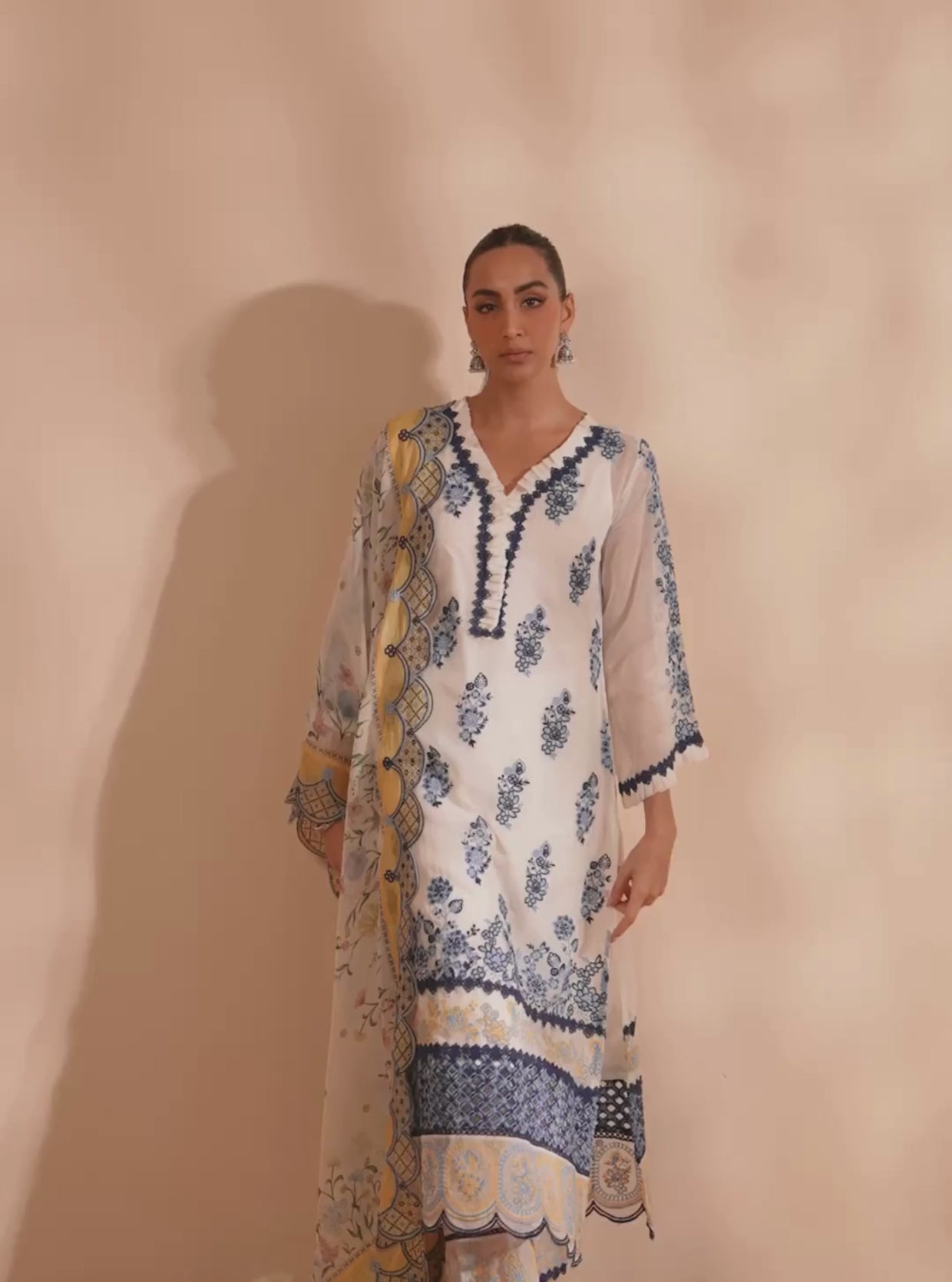 Bask In The Breezy Elegance Of This Summer-Perfect Embroidered Kurta Set, Crafted To Keep You Effortlessly Stylish In Warm Weather. Tailored In Lightweight, Breathable Organza, The White Kurta Is Adorned With Intricate Blue Floral Motifs, Creating A Delicate Yet Striking Contrast. A Beautifully Ornate Hemline Lends A Contemporary Edge, Seamlessly Blending With The Straight-Fit Silhouette For All-Day Comfort. The Kurta Is Paired With Straight Pants Featuring Subtle Embroidery At The Cuffs.