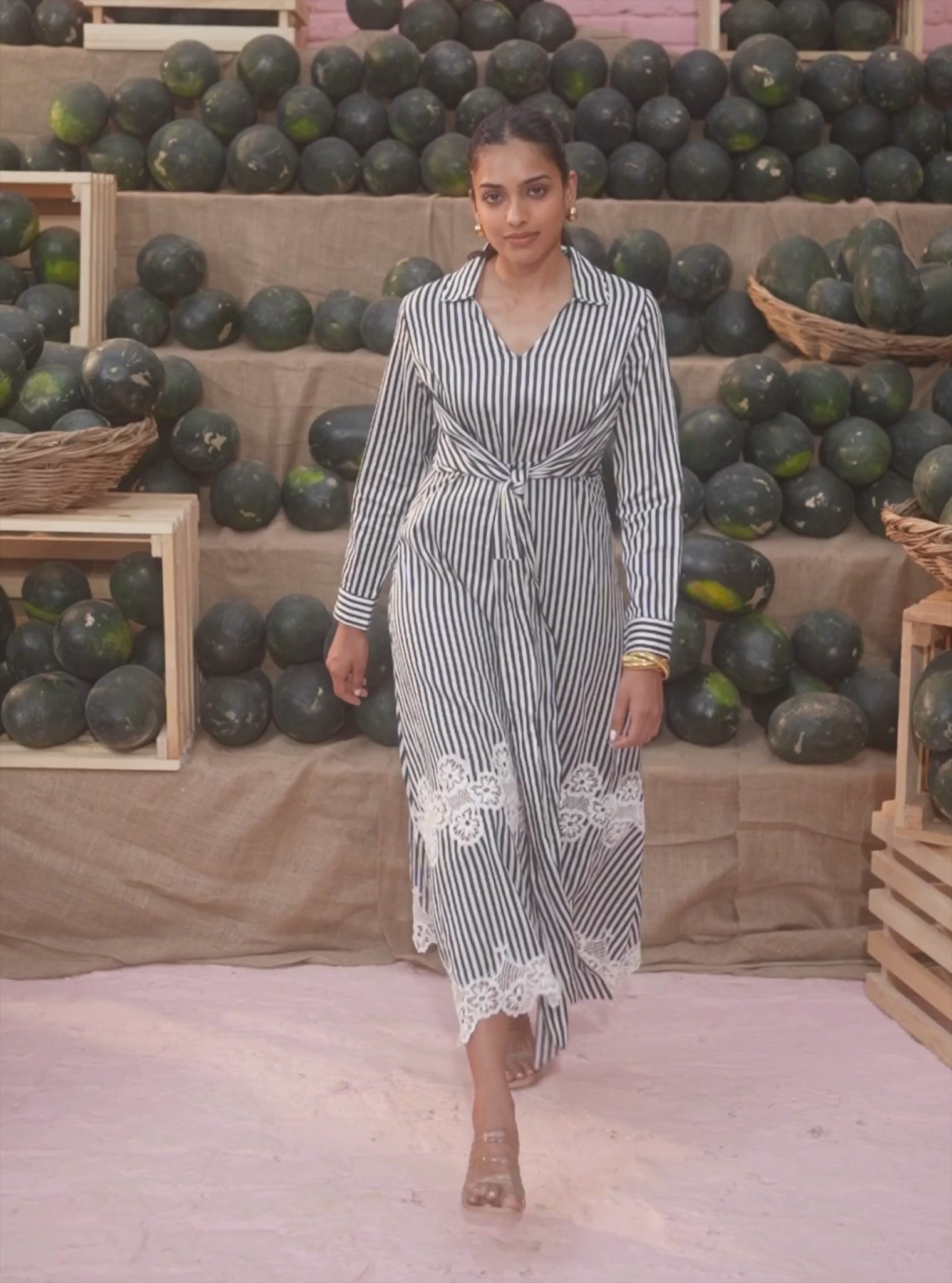 We Have The Perfect Dress For Your Evening Out With Friends Or Soirees. This Long Dress Features An Open V-Neckline With Defined Collars, Full Ciffed Sleeves, And A Stunning Asymmetrical Hemline. Two Panels Of Floral White Lace Add A Touch Of Feminity To The Black And White Striped Dress. The Waist Is Cinched By A Stylish Tie-Up Detail That Adds Structure And Character To The Ensemble.