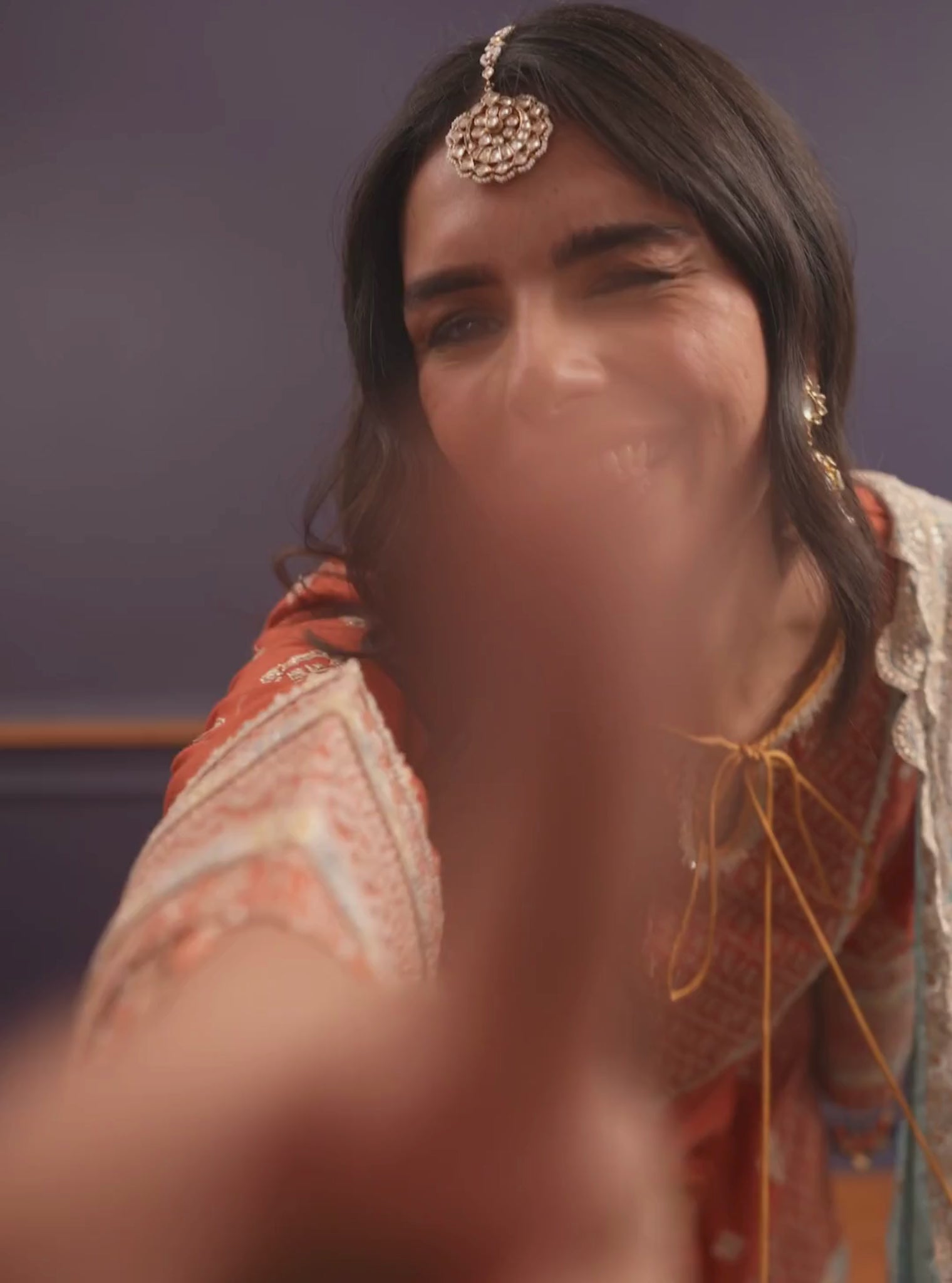 A Bold Orange Kurta In Soft Pima Satin, Styled With Mustard Sharara Pants For A Striking Contrast. Draped With A Sky Blue Organza Dupatta, This Set Feels Vibrant, Youthful, And Perfect For Celebratory Dressing