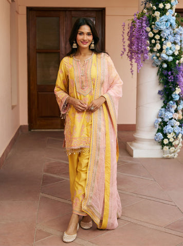 Crafted in premium Pima Satin, this kurta set is equal parts festive and functional. The kurta is detailed with intricate embroidery that adds richness while maintaining a clean, modern feel. Paired with matching Pima Satin pants that offer structure without stiffness. Completed with a contrasting dupatta to bring depth and visual interest.