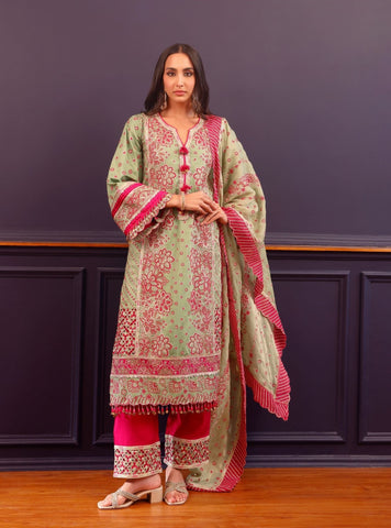 Crafted In Soft Pima Satin, The Renu Kurta Set In Sky Blue Blends Subtle Sheen With Traditional Artistry. The Straight-Cut Kurta Is Adorned With Intricate Motifs And Lace-Trimmed Edges, Paired With Coordinated Pants That Balance Structure And Flow. Completing The Look Is A Lurex-Insert Dupatta That Adds A Touch Of Shimmer — The Perfect Choice For Understated Festive Dressing.