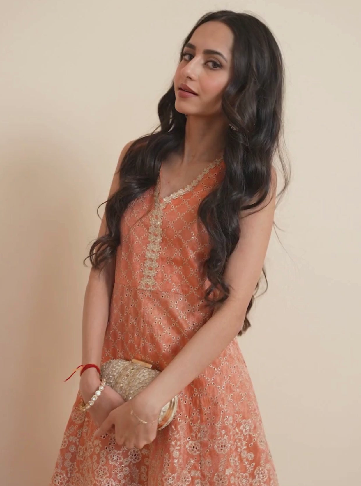 Graceful And Refreshing, This Soft Burnt Orange Co-Ord Set Is A Masterpiece Of Understated Elegance. The Sleeveless Peplum Kurta, Featuring Delicate Jaali Embroidery And Scalloped Edges, Is Designed To Flatter Your Figure While Exuding Feminine Charm. The Matching Flared Palazzo Pants Complement The Kurta Effortlessly. It Is A Versatile Choice For Daytime Festivities, Intimate Gatherings, Or Summer Celebrations.