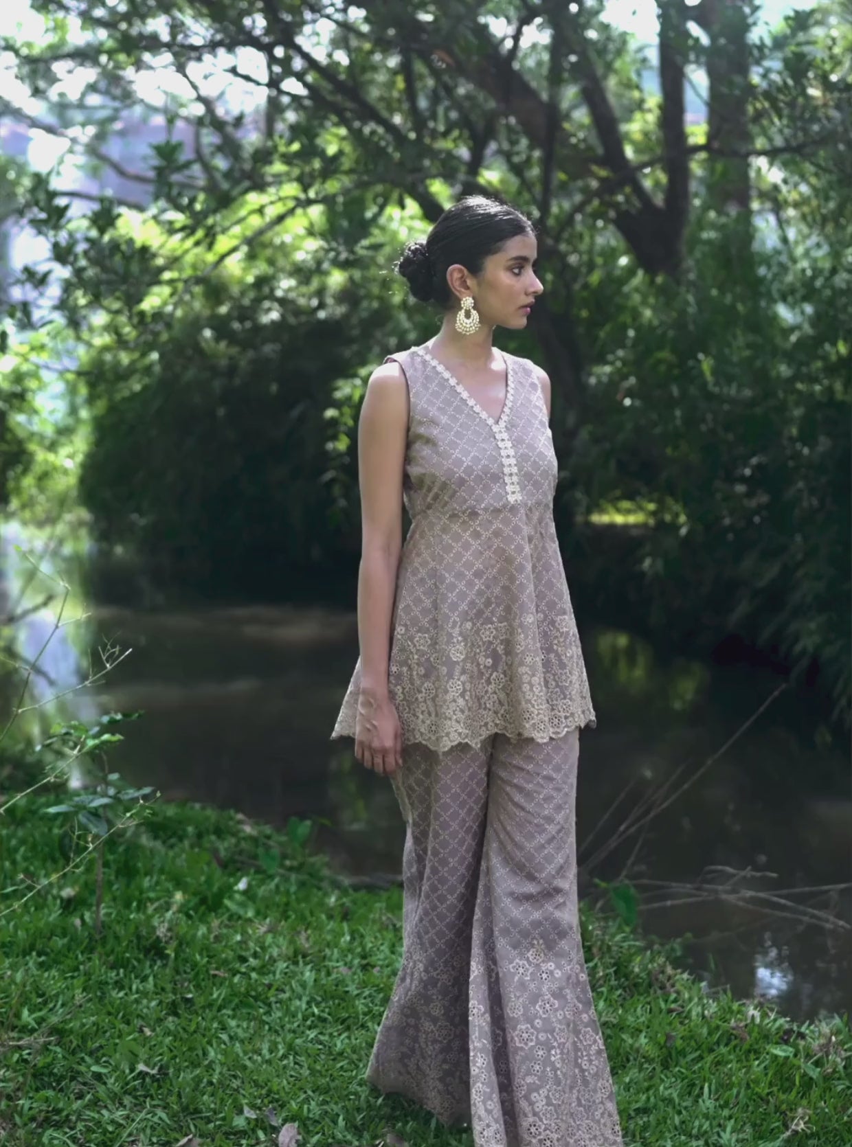 Graceful And Refreshing, This Soft Lavender Co-Ord Set Is A Masterpiece Of Understated Elegance. The Sleeveless Peplum Kurta, Featuring Delicate Jaali Embroidery And Scalloped Edges, Is Designed To Flatter Your Figure While Exuding Feminine Charm. The Matching Flared Palazzo Pants Complement The Kurta Effortlessly. It Is A Versatile Choice For Daytime Festivities, Intimate Gatherings, Or Summer Celebrations.