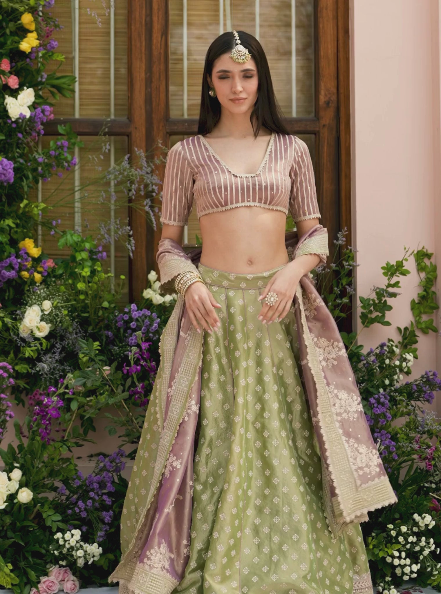 A refined blend of colour and texture, this tissue lehenga set offers a light drape and an elevated festive feel. Comfortable yet striking, it’s perfect for mehendi functions, evening celebrations, and modern wedding moments.