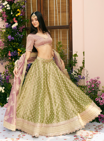 This tissue lehenga set pairs a softly structured lehenga with a delicately crafted tissue blouse. Light-catching and graceful, it’s designed for wedding celebrations, festive evenings, and moments that call for subtle statement dressing.