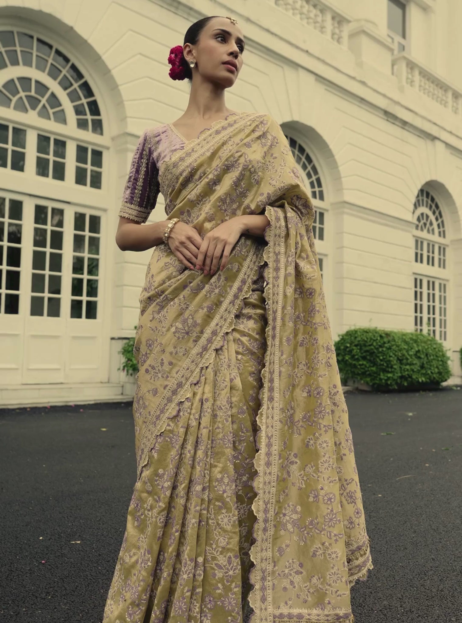 A pista-gold tissue saree with a luxurious iridescent finish and finely woven texture. The saree is paired with a contrasting velvet blouse in deep purple, adding warmth and richness. Effortless to drape and inherently dressy, this piece is perfect for winter celebrations.