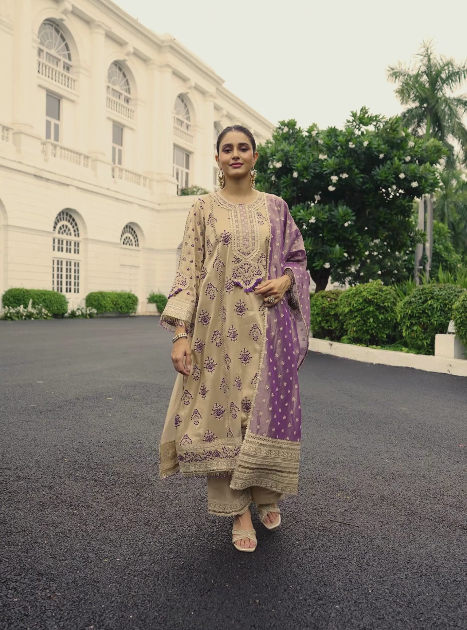 Paired With Coordinating Champagne-Hued Bottoms For A Seamless, Polished Look, The Ensemble Is Completed With A Striking Purple Tissue Nayana Dupatta. Its Contrasting Hue And Delicate Border Work Add A Vibrant Pop Of Color, Making The Set A Refined Choice For Festive Gatherings And Cultural Celebrations.