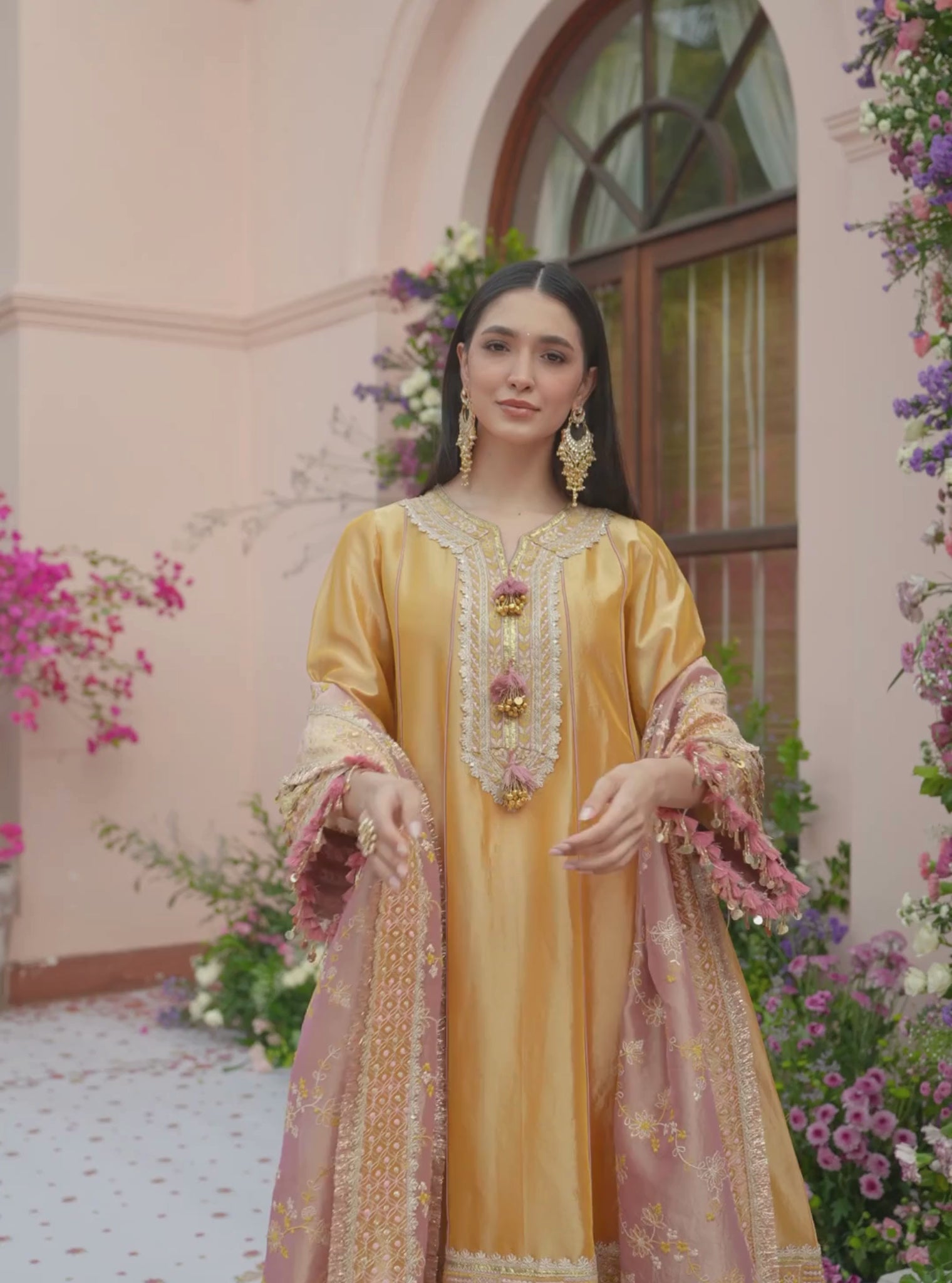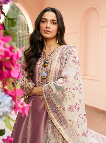 An elevated festive ensemble crafted in lightweight Tissue fabric with a gentle sheen. The kurta is detailed with delicate embroidery that adds texture while keeping the silhouette clean and graceful. Paired with matching Tissue pants for a soft, structured fall. Completed with a coordinating dupatta that brings balance and movement to the set.