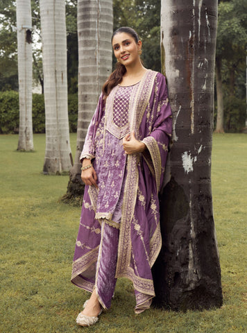 A timeless olive-green velvet dhoti-kurta set featuring intricate embroidery and finished with a Banarasi dupatta. A fresh, youthful take on classic festive dressing.