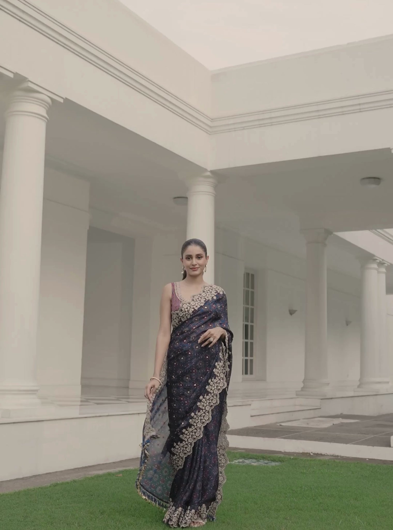 Crafted in navy organza with a delicate Ajrakh print, this saree feels featherlight yet festive. Perfect for evening weddings and refined celebrations.